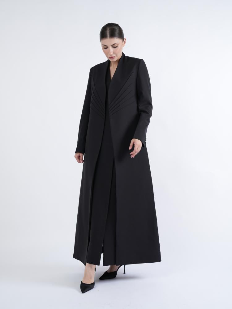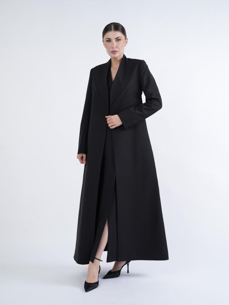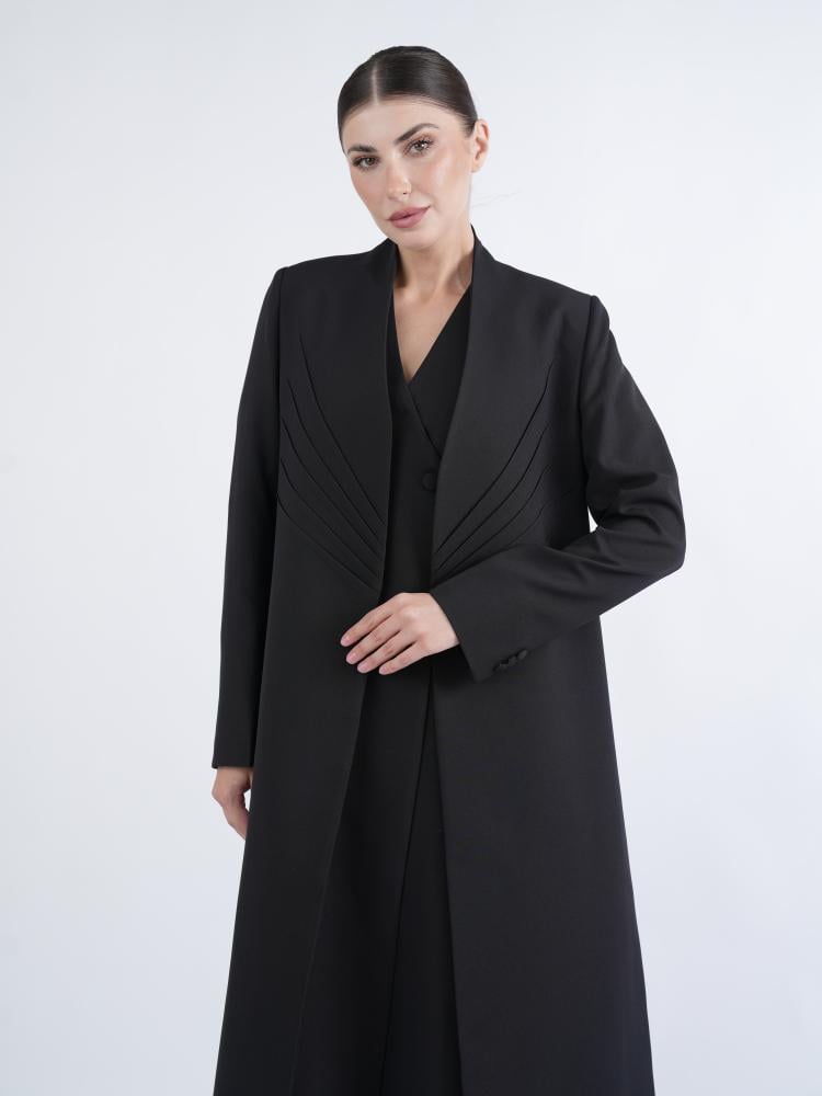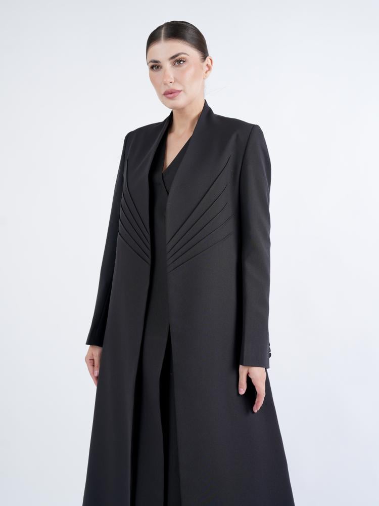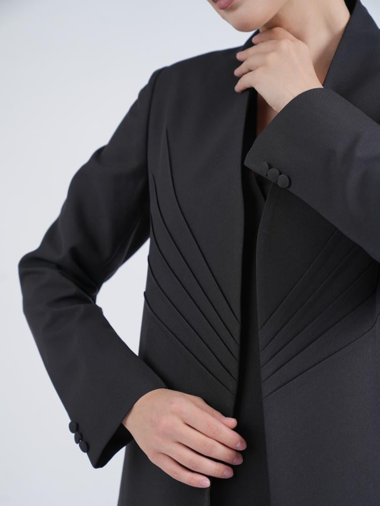 بليزر أسود بتصميم استثنائي، تميّزه خطوط مطرزة بارزة تعكس دقة التفاصيل وأناقة الحضور