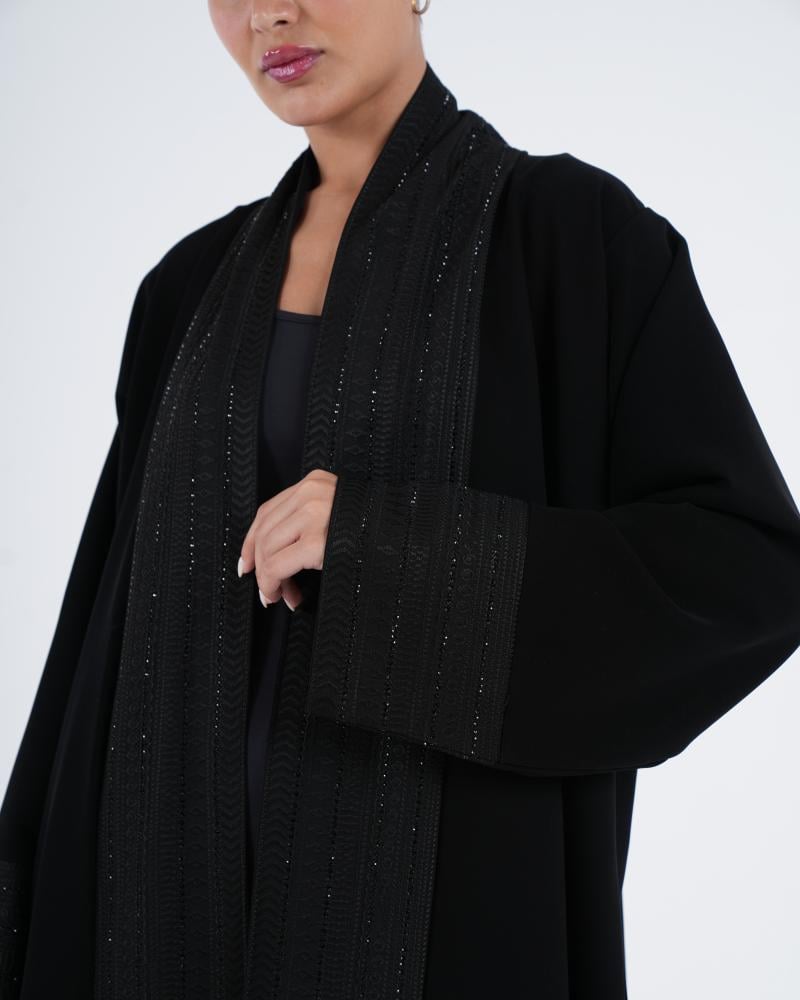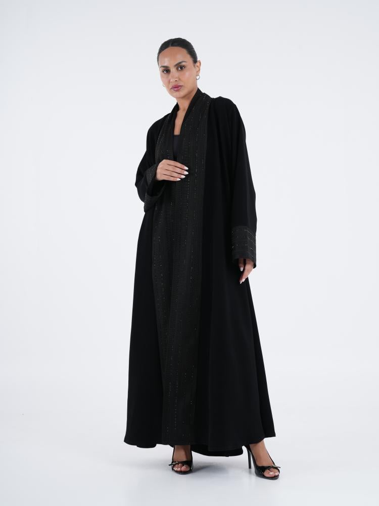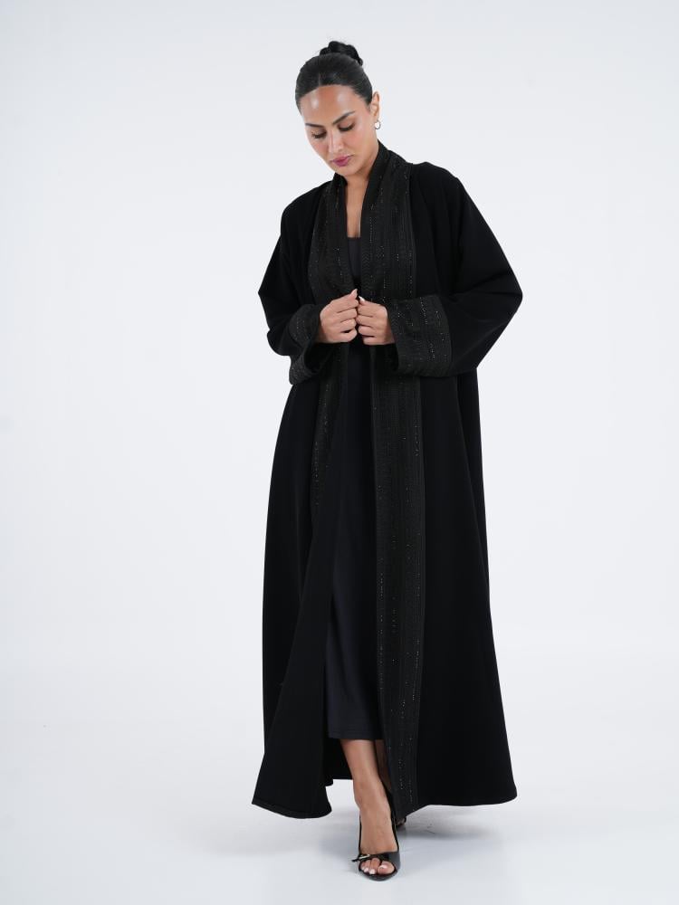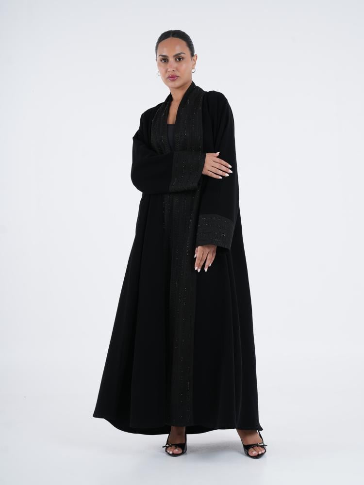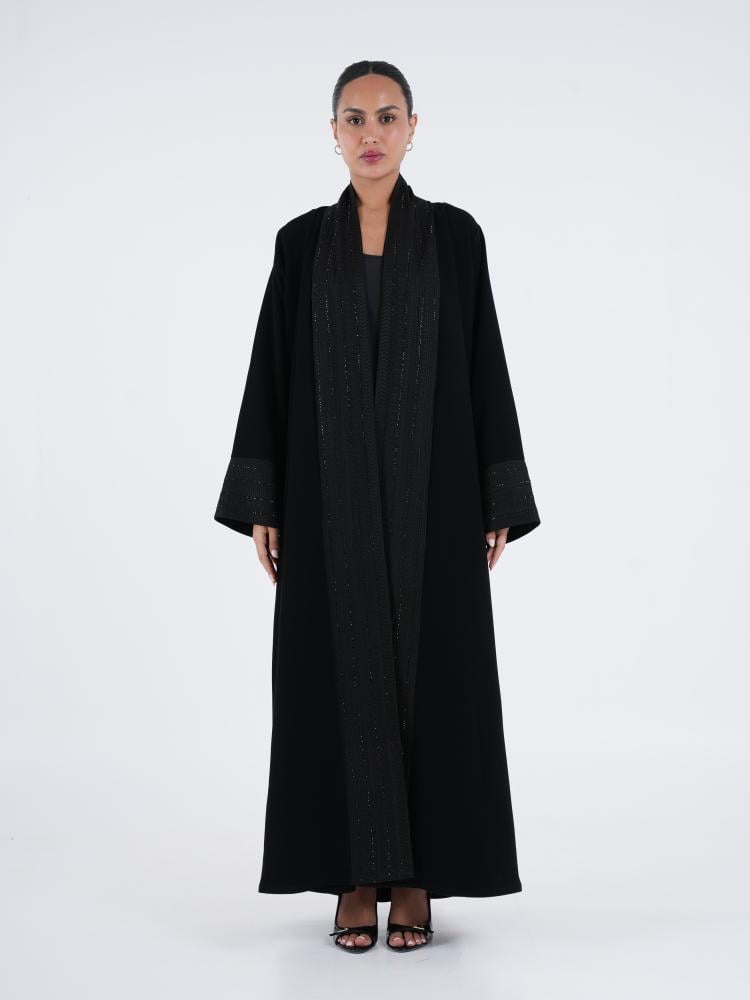 عباية سوداء راقية، مزينة بتطريز أنيق باللون نفسه،